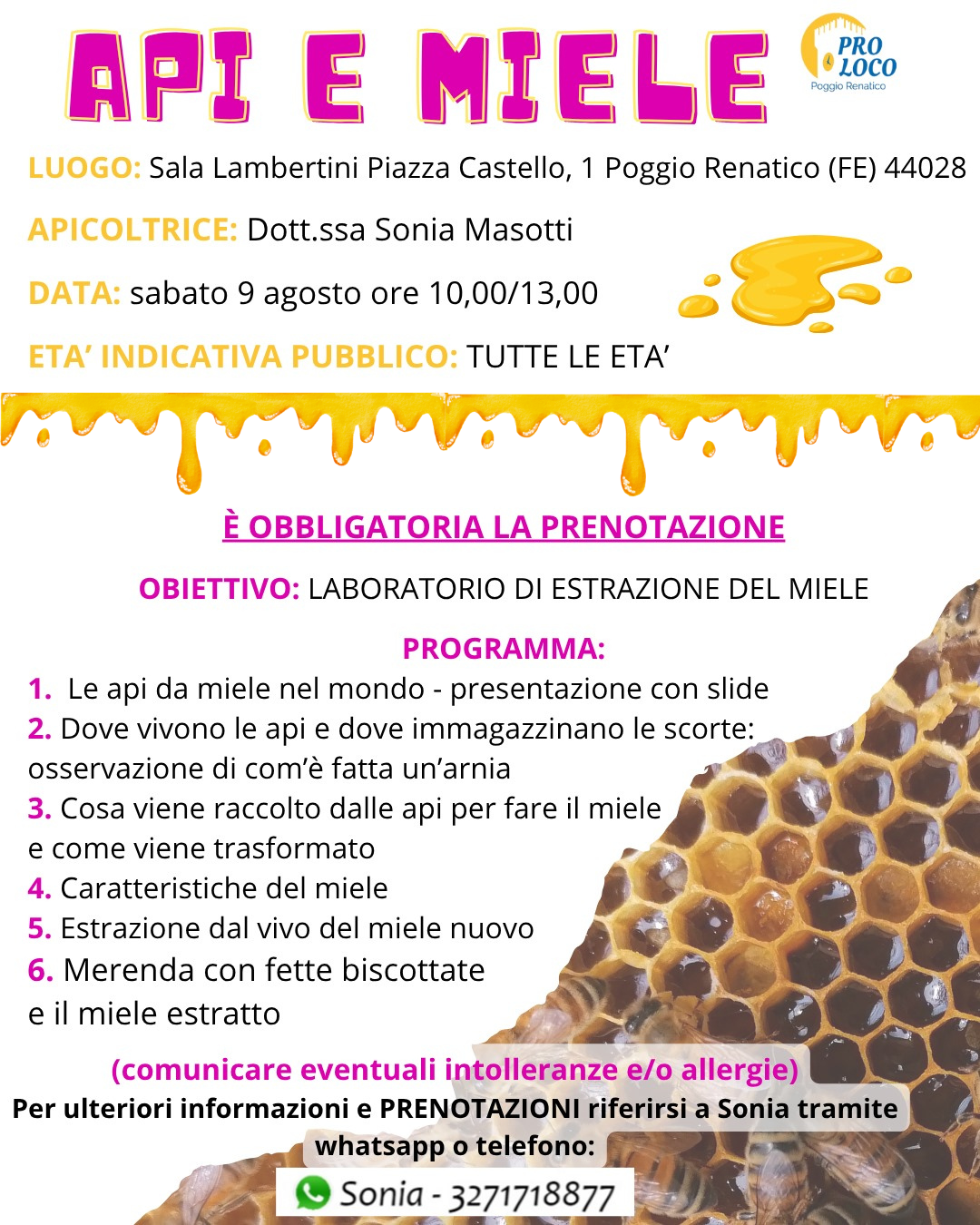 Un appuntamento speciale per grandi e piccini: venerdì 9 agosto, dalle ore 10.00 alle 13.00, la Sala Lambertini in Piazza Castello 1 a Poggio Renatico ospiterà un laboratorio dedicato al miele e alle api, curato dalla Dott.ssa Sonia Masotti, apicoltrice professionista.